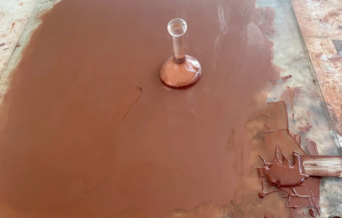 Slaking is commenced made by mixing four cups of plaster in 12 litres of water and agitating past the setting point (15 minutes), waiting a few minutes for the plaster to settle, syphoning off the water, adding more fresh water with further agitation. The process is repeated over three days until the plaster sits cleanly at the bottom and the water is clear. The slaked plaster of Paris is then poured over a tray and when dry is combined with titanium dioxide and rabbit skin glue to make the Gesso Sottile ground which is the foundation or undercoat for the subsequent paint layers. To complete the process the gesso is coated with 10% buffered formalin.