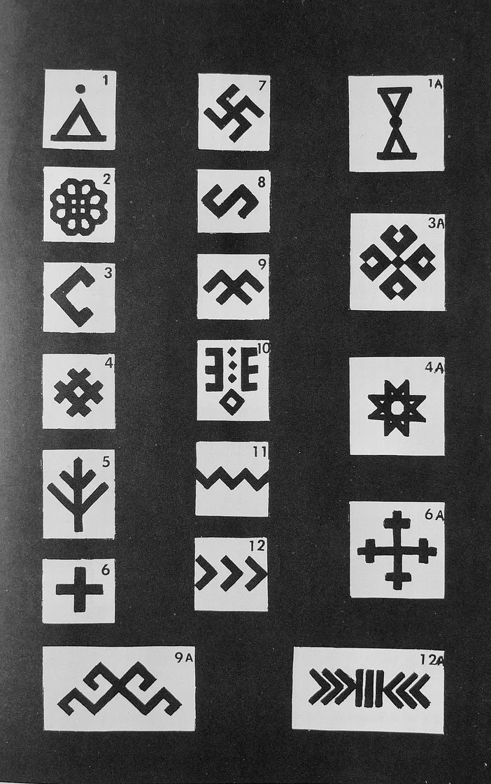 Piekalns’ geometric abstractions are derived from Latvian pre-Christian/pre-alphabet symbols or runes based on a square grid. These geometric forms represent deities such as God, Mother Earth, and Fate; the celestial stars, sun and moon; and earthly phenomenon like lightning and fire.